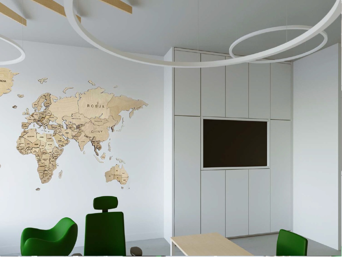 Nowa koncepcja uwzględnia podział pomieszczenia na dwie strefy: strefę przeznaczoną na pracę i obsługę interesantów oraz strefę spotkań. Stylistyka koncepcji nawiązuje do motywów roślinnych – pnia drzewa z koroną.