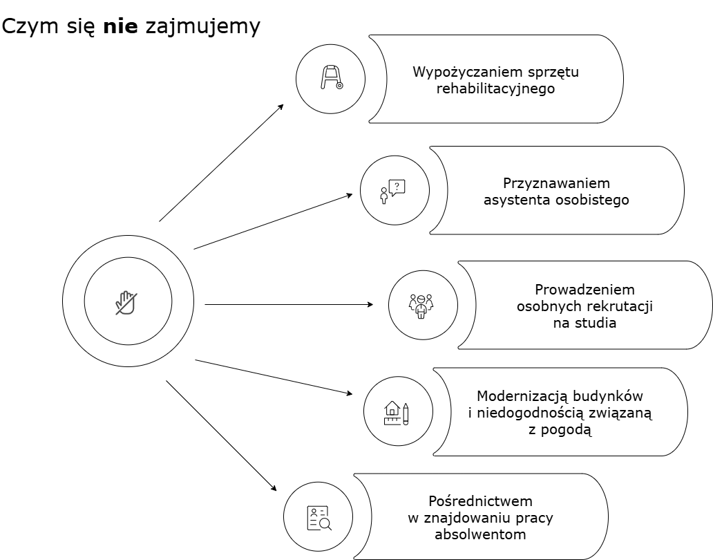 - organizacja wsparcia dla osób z niepełnosprawnościami i osób z innymi szczególnymi potrzebami w dostępie do uprawnień i usług służących zapewnieniu dostępności oraz określonych wewnętrznymi regulacjami Uczelni;