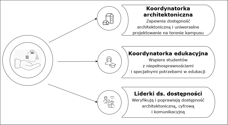Na każdym Wydziale powołany został koordynator ds. studentów z niepełnosprawnościami. Każdy student/ doktorant z niepełnosprawnością lub szczególnymi potrzebami może skorzystać ze wsparcia wydziałowego koordynatora.