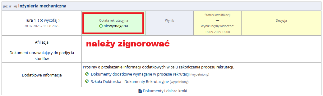 Prosimy nie sugerować się informacją z Państwa kont aplikacyjnych o niewymaganiu opłaty, ponieważ jest to błędny komunikat (przykład poniżej). Ze względów technicznych nie jest możliwe jego wyłączenie.