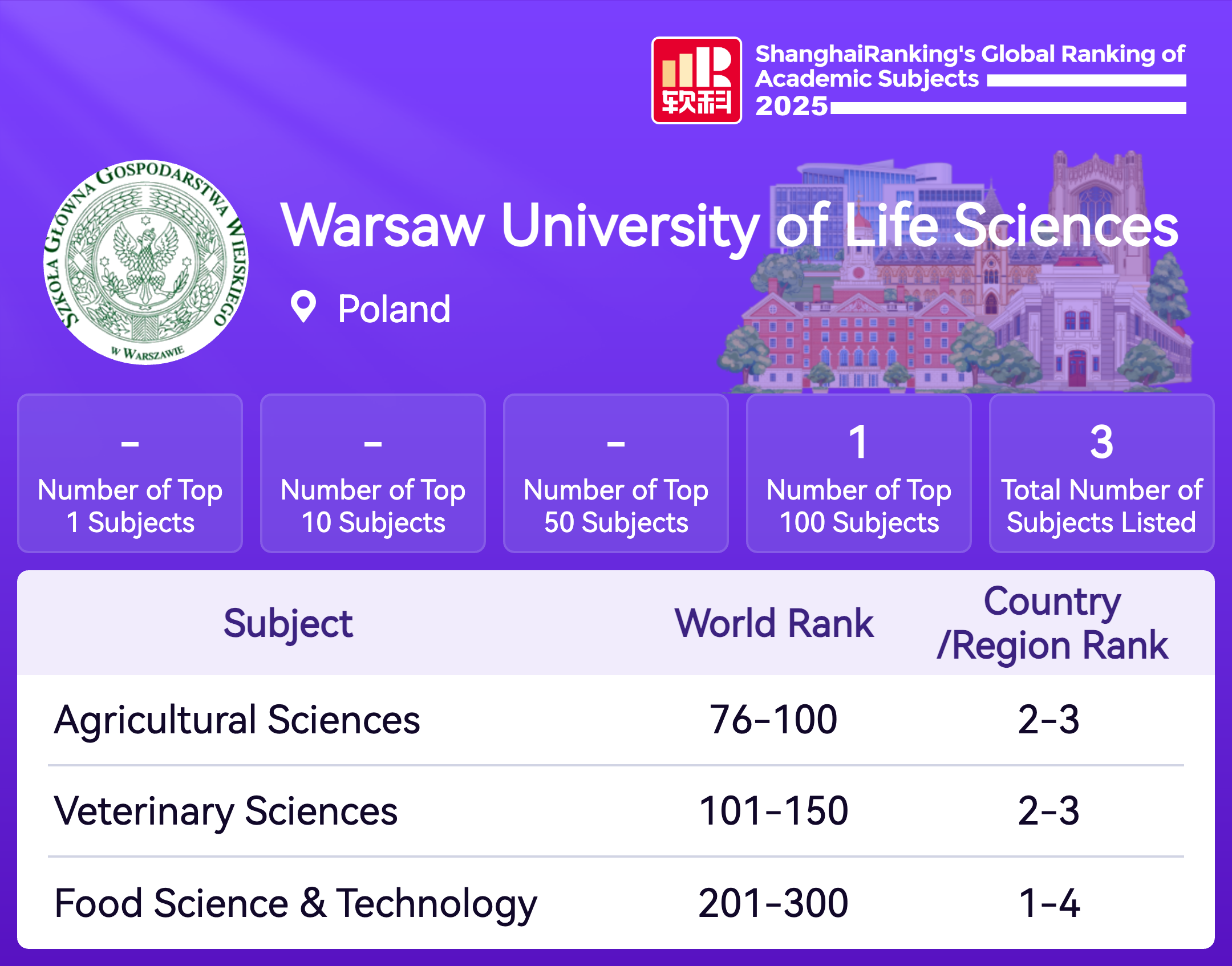 Szkoła Główna Gospodarstwa Wiejskiego w Warszawie ponownie znalazła się w czołówce najlepszych uczelni na świecie według tegorocznej edycji Global Ranking of Academic Subjects (GRAS).
