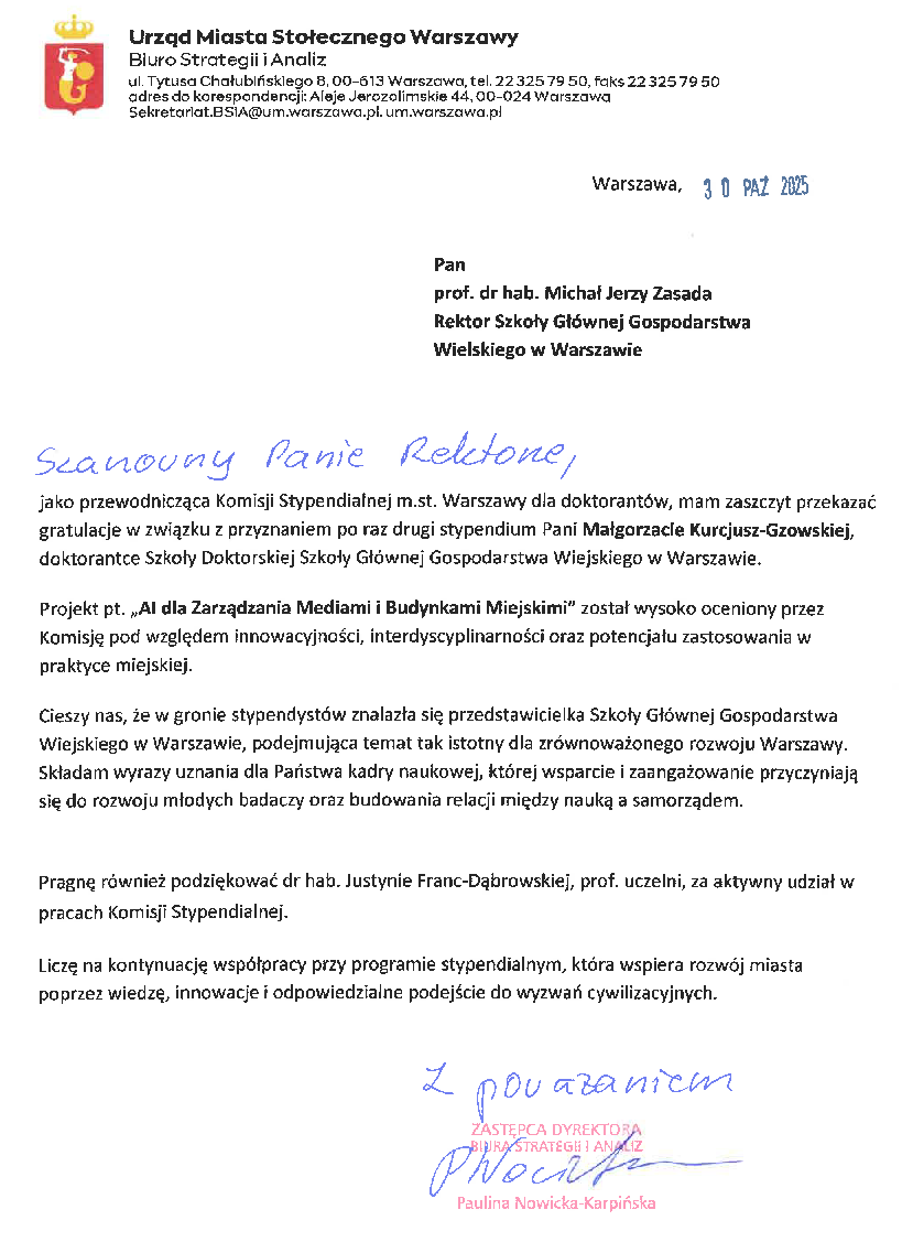 Urząd Miasta Stołecznego Warszawy poinformował, że w gronie stypendystów znalazła się nasza doktorantka p. Małgorzata Kurcjusz-Gzowska, która otrzymała po raz drugi stypendium.
