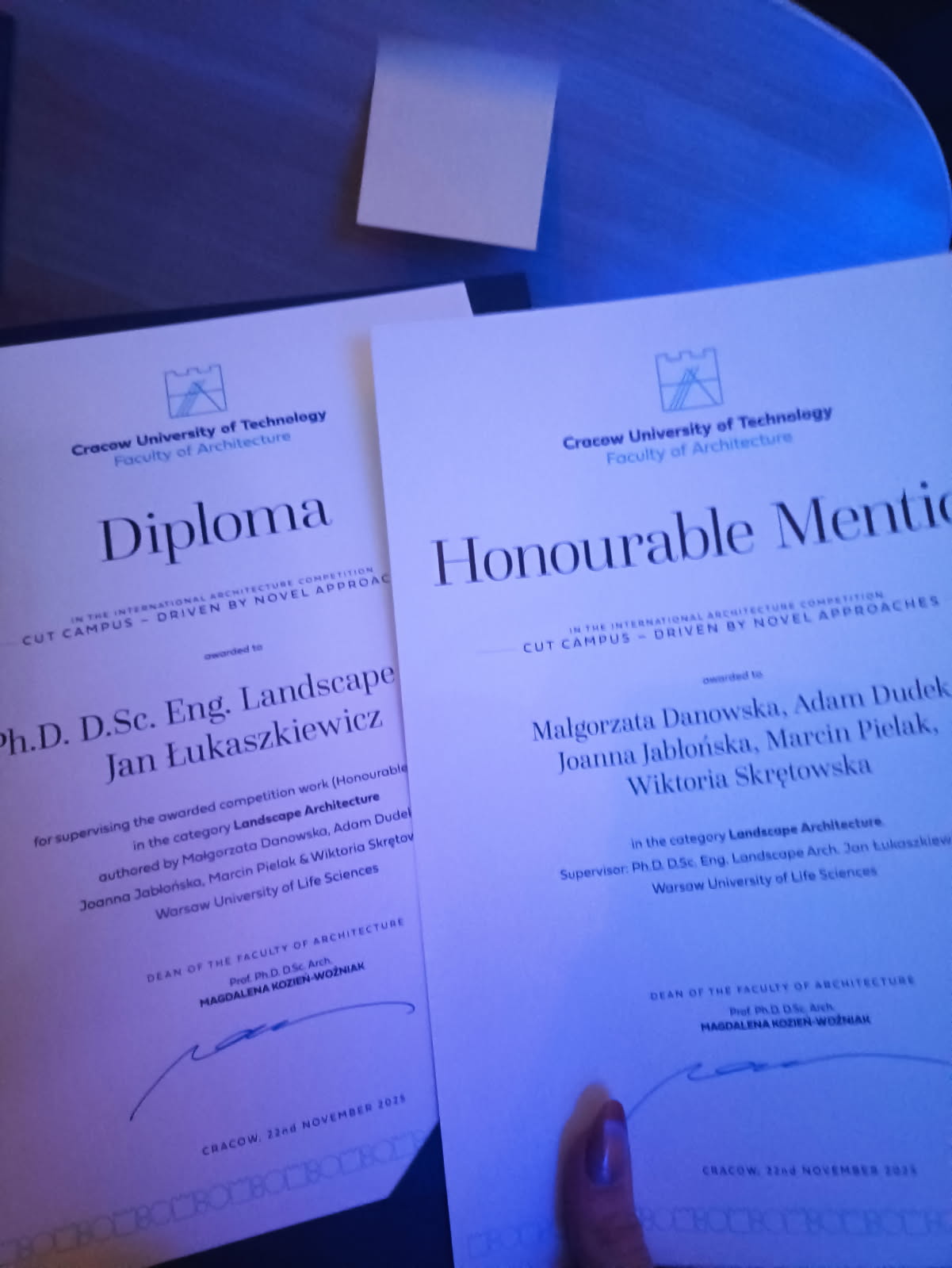 Studenci kierunku Architektura Krajobrazu Szkoły Głównej Gospodarstwa Wiejskiego w Warszawie zdobyli wyróżnienie w międzynarodowym konkursie architektoniczno-urbanistycznym CUT Campus 2025: Driven by novel approaches. Ogłoszenie wyników odbyło się 22 listopada 2025 r. podczas uroczystej gali, która miała miejsce w sali Konferencyjno-Wystawniczej „Kotłownia” Politechniki Krakowskiej.