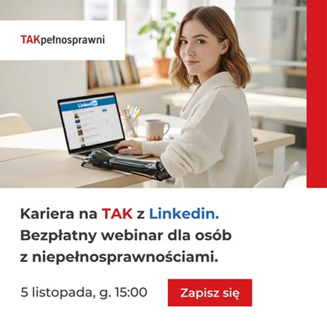 Droga Studentko, Drogi Studencie, Fundacja TAKpełnosprawni zaprasza osoby z niepełnosprawnościami na bezpłatny webinar o LinkedIn – praktyczne spotkanie pokazujące, jak wykorzystać tę platformę w rozwoju kariery. Dowiesz się m.in.:• jak stworzyć i prowadzić profil,• jak skutecznie szukać pracy,• w jaki sposób LinkedIn może wspierać Twój rozwój zawodowy. Webinar Kariera na TAK z LinkedIn:__________________________________________📅 5 listopada […]