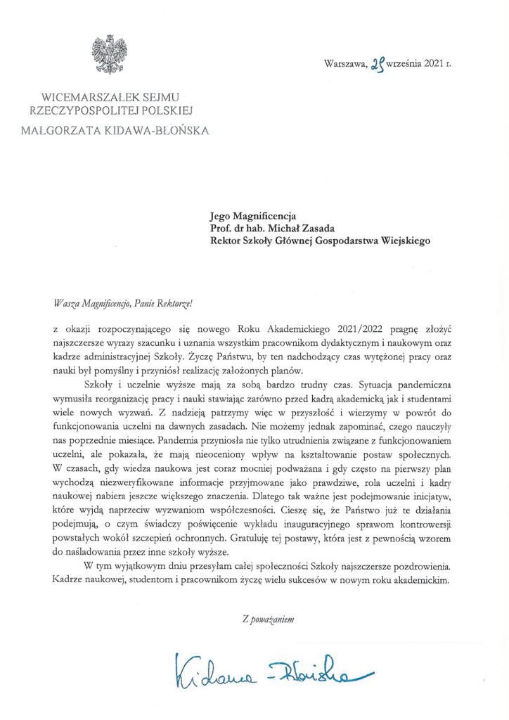 Głos zabrał również Prezydent Rzeczypospolitej Polskiej Andrzej Duda. W swoich słowach odwołał się do bogatej historii Szkoły Głównej Gospodarstwa Wiejskiego, a także jej tradycji sięgającej Instytutu Agronomicznego. Kończąc wystąpienie Prezydent RP powiedział: „Szanowni Państwo, mam nadzieję, że ten rok akademicki – mimo niestety wznoszącej się kolejnej fali koronawirusa – będzie rokiem przebiegającym bardziej normalnie niż poprzedni. Mam nadzieję, że studenci będą mogli spotykać się ze swoimi rówieśnikami oraz wykładowcami. Ma to istotne znaczenie nie tylko ze względu na edukację i jej jakość, ale także w wymiarze społecznym – ze względu na budowanie wspólnoty w ramach uczelni. Tego właśnie życzę całej społeczności akademickiej – zwłaszcza studentom, którzy dopiero wstępują w mury uczelni. Aby ten czas, który tutaj spędzą, wspominali później jako jeden z najpiękniejszych okresów swojego życia, który przyniósł im największy pożytek w rozwoju. Życzę Państwu powodzenia i zdrowia. Wszystkiego dobrego dla Uczelni.”