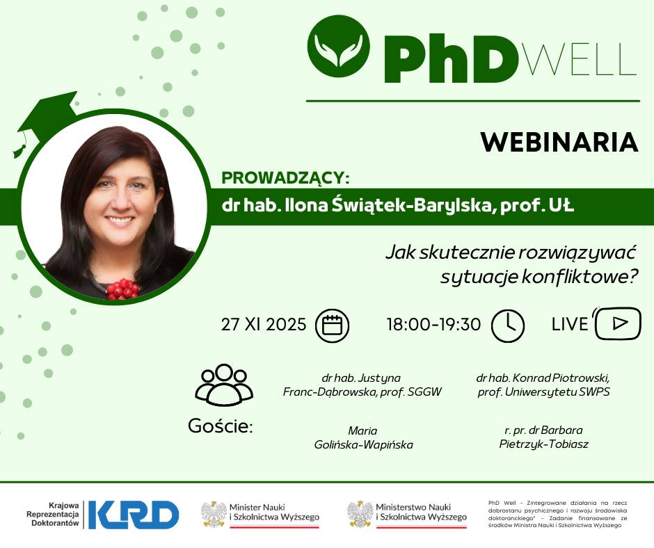 W ramach projektu PhD Well – Zintegrowane działania na rzecz dobrostanu psychicznego i rozwoju środowiska doktoranckiego serdecznie zapraszamy na bezpłatne webinarium online, poświęcone praktycznym sposobom radzenia sobie z sytuacjami spornymi: