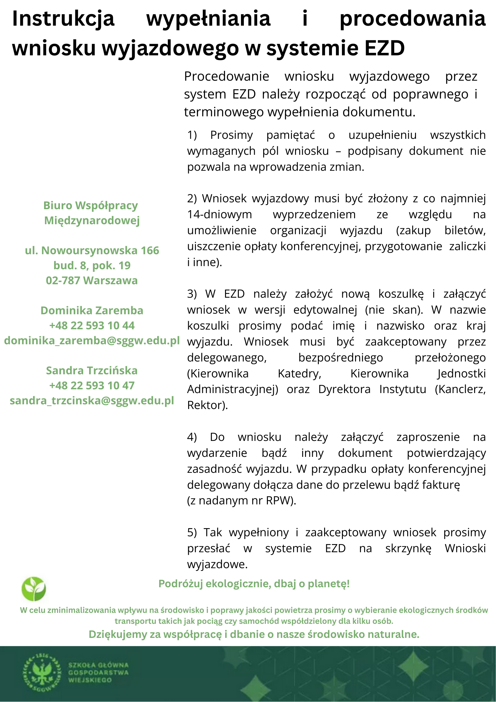 Zgodnie z Zarządzeniem Nr 6 Rektora Szkoły Głównej Gospodarstwa Wiejskiego w Warszawie z dnia 09.04.2009r. w celu odbycia wyjazdu zagranicznego pracownik SGGW lub osoba niebędąca pracownikiem SGGW, doktorant lub student zobowiązany jest do złożenia na min. 14 dni przed wyjazdem w Biurze Współpracy Międzynarodowej (ul. Nowoursynowska 166, 02-787 Warszawa, bud 8, pok. 19) wniosku na wyjazd zagraniczny.